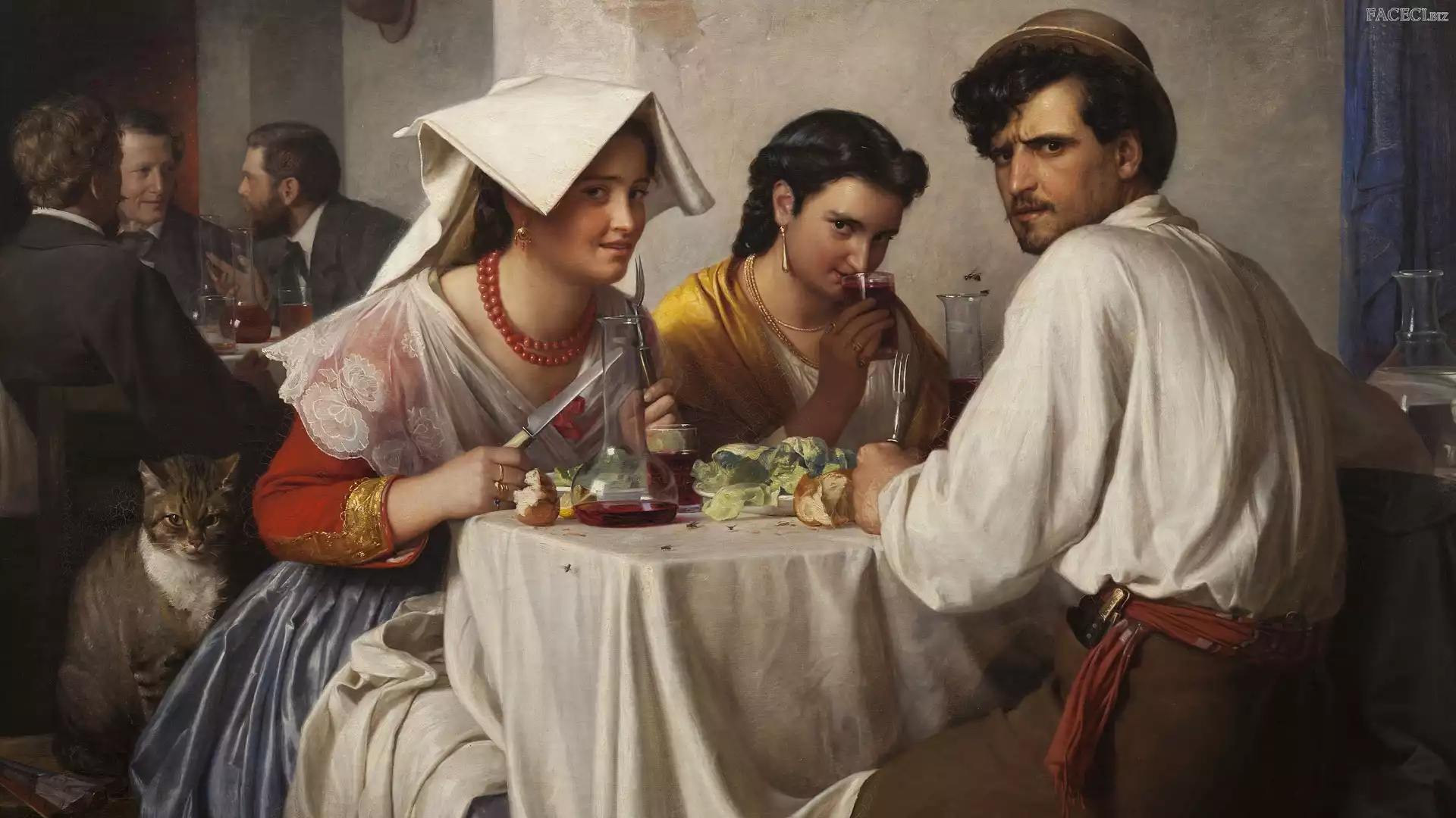 Dwie, Jedzenie, Mężczyźni, Stolik, Malarstwo, Obraz, Kot, Restauracja, Carl Bloch, Kobiety - faceci.biz |